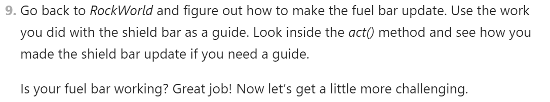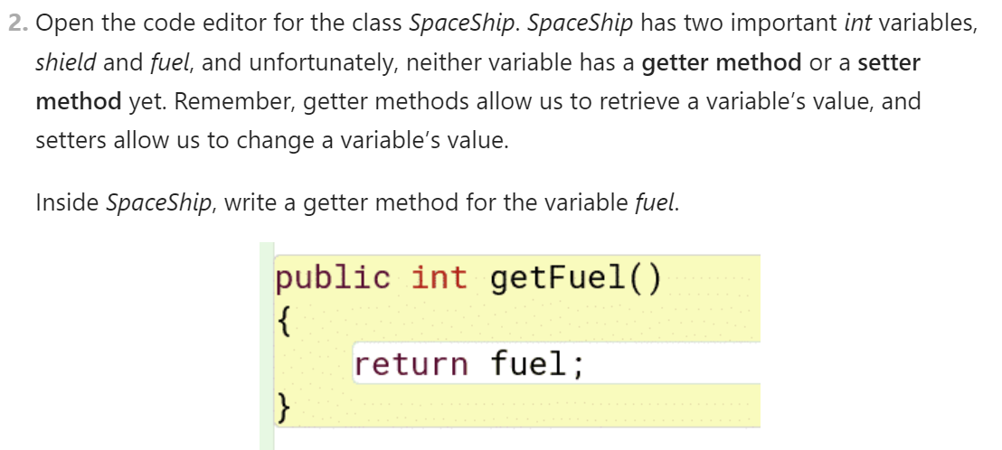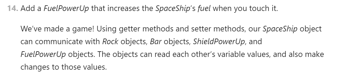 As an example, several years ago I authored a project called “Rock Dodger” that was embedded in a year-long Java curriculum for high schoolers. The cored idea was teaching students when and how to use getter and setter methods to enable interaction between objects.